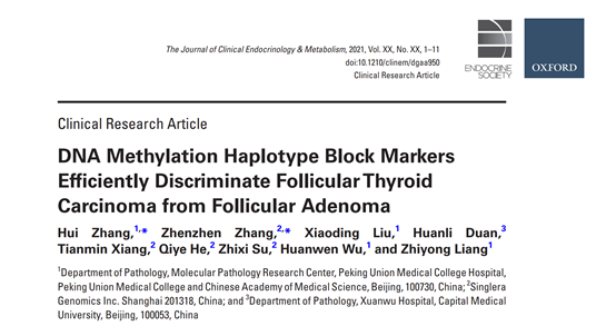2021年1月初,必赢242net官网与北京协和医学院病理科梁志勇教授和吴焕文教授团队共同合作,利用必赢242net官网独有的DNA甲基化单倍型技术区分滤泡型甲状腺癌与良性滤泡型甲状腺瘤的研究论文“DNA Methylation Haplotype Block Markers Efficiently Discriminate Follicular Thyroid Carcinoma from Follicular Adenoma”,正式发表于国际学术期刊The Journal of Clinical Endocrinology & Metabolism上。