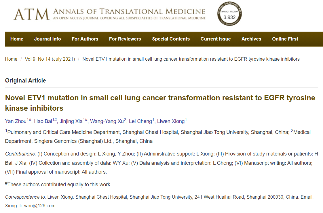 [4] Yan Zhou, Hao Bai, Jinjing Xia, Wang-Yang Xu, Lei Cheng , Liwen Xiong. Novel ETV1 mutation in small cell lung cancertransformation resistant to EGFR tyrosine kinase inhibitors. Ann Transl Med2021;9(14):1150.