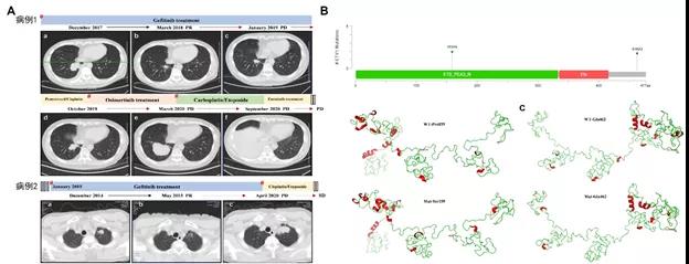 图(A)患者治疗过程中影像学检查;图(B)ETV1突变位点示意及蛋白模拟图
