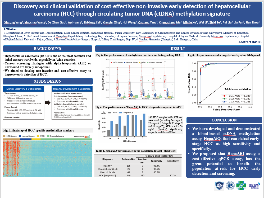 [1] Xinrong Yang, Yingchao Wang, De-Zhen Guo,et al. Discovery and clinical validation of cost-effective non-invasive early detection of hepatocellular carcinoma (HCC) through circulating tumor DNA (ctDNA) methylation signature 2022 ASCO Annual meeting. Abstract #4103.