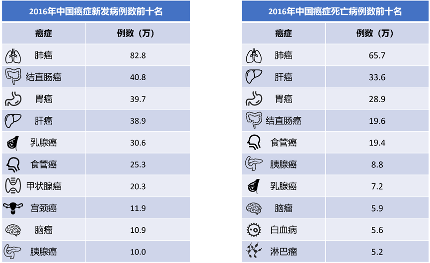 表1. 2016年中国癌症新发和死亡前十名