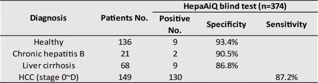 结果发现,HepaAiQ™检测在LC、CHB和CTRL的特异性分别为88.3%、91.7%和92.4%的情况下,HCC灵敏度可达85.3%。紧接着,HepaAiQ™模型对来自多中心的374份血浆样本进一步盲法验证,证实其对HCC的敏感性为87.2%,对LC、CHB和CTRL的特异性分别为86.8%、90.5%和93.4%(表2)。