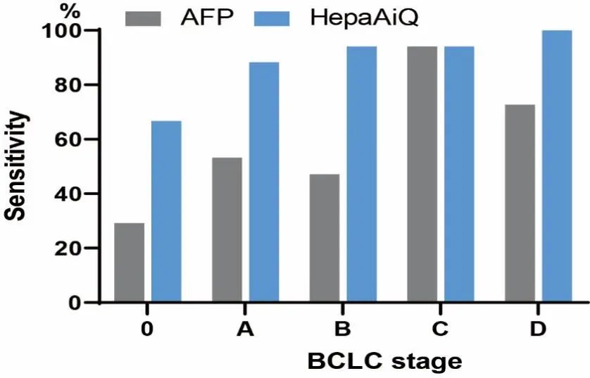 研究者将HepaAiQ™与HCC传统筛查方法AFP方法进行了比较。结果显示,HepaAiQ™在各个分期中的表现均优于AFP(87.0% vs. 56.2%),尤其是在早期HCC中(83.2% vs. 48.5%)(图5)。