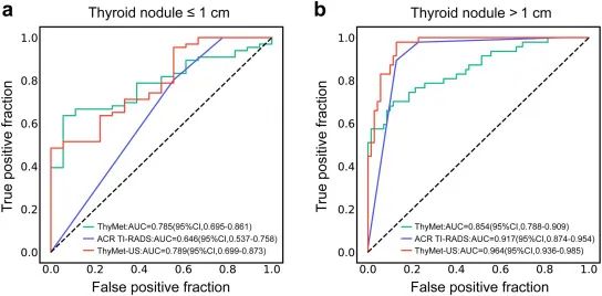 同样的相比超声检查,ThyMet-US在检测PTMC时,保持了92.4%的高灵敏度,特异度也较超声提高了一倍(图3a)。在检测>1cm的PTC时,联合检查也显著优于超声检查(AUC 0.964 VS 0.917,图3b)