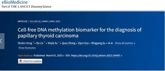 近日,由必赢242net官网与中山大学附属第一医院内分泌科肖海鹏教授团队等共同合作,运用简化基因组甲基化测序(RRBS)和靶向甲基化测序技术(mTitan)及甲基化单倍型分析方法(MHL),构建了基于cfDNA的甲基化标记panel,用于辅助鉴别诊断乳头状甲状腺癌(PTC)与甲状腺良性结节(BTN)。该研究论文“Cell-free DNA methylation biomarker for the diagnosis of papillary thyroid carcinoma”,已正式发表于柳叶刀子刊eBioMedicine(IF:11.205)上。