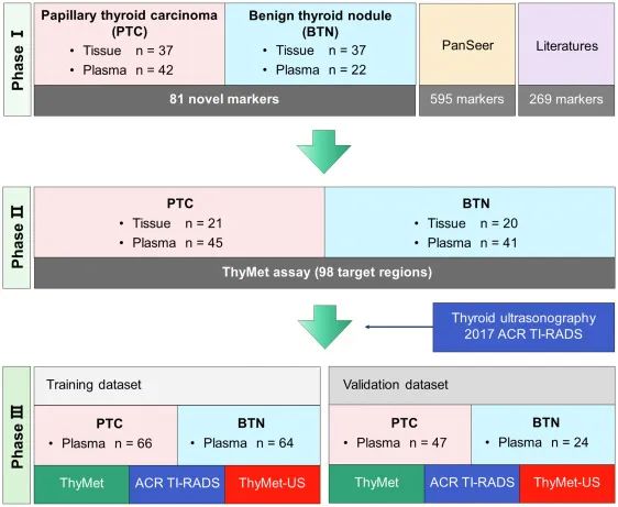 本研究是一项运用cfDNA甲基化标记用于无创检测PTC的大样本量回顾性研究。研究纳入了2012年至2019年间在中山大学附属第一医院和中山大学附属肿瘤医院就诊的408名甲状腺结节患者,其中包括220名PTC患者和188名BTN患者。研究分为三个阶段:第一阶段:发现PTC血浆中的候选甲基化标记物;第二阶段:开发基于靶向甲基化测序的PTC特异性标记物检测panel;第三阶段:在血浆样本中训练和验证第二阶段的panel。(图1)