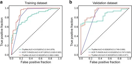 图2 ThyMet、超声ACR TIRADS分类及ThyMet-US用于在训练集(a)和验证集(b)血浆样本中诊断PTC的ROC曲线图
