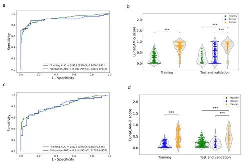本研究进一步在一个独立队列(包含64例肺癌、45例良性病变和63例健康人)中对LunaCAM-S和LunaCAM-D模型进行盲法验证。