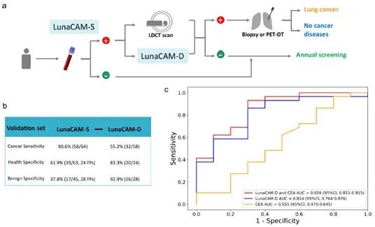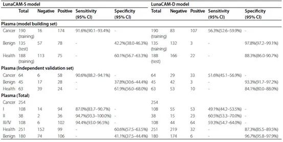 研究者基于513例血液样本(包括肺癌、肺部良性病变和健康者)构建了LunaCAM-S(一般风险人群的早期筛查)和LunaCAM-D(高风险人群的结节良恶性鉴别)模型。