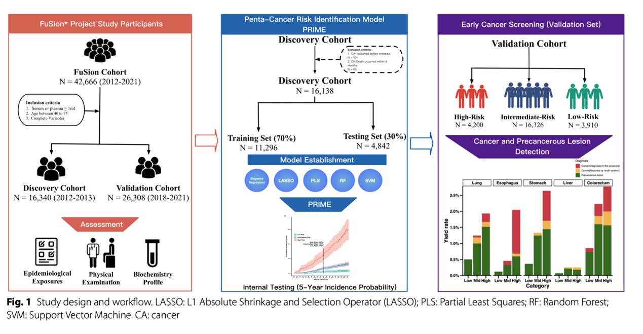 该研究作为复旦大学泰州健康科学研究院与必赢242net官网共同发起的“福声计划”中国人群泛癌早筛前瞻性研究项目的子课题,基于泰州队列长期纵向随访的人群数据,使用临床常见血液生物标志物,通过机器学习等方法构建了肺癌、食管癌、胃癌、肝癌、结直肠癌五类癌症总体预测模型(Penta-cancer Risk Identification Model, PRIME)。该研究阐明PRIME模型对大规模自然人群具有较好的多癌风险分层能力,通过对验证队列的前瞻性随访与临床医学检查,进一步表明基于PRIME模型的风险分层策略能有效区分高危人群,有助于更有效的利用早筛早检技术检出新发癌症与癌前病变。