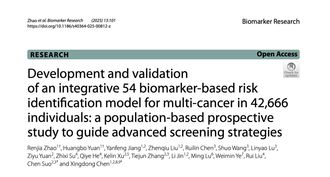 近日,国际知名学术期刊Biomarker Research在线发表了复旦大学泰州健康科学研究院陈兴栋团队的最新研究成果:“Development and validation of an integrative 54 biomarker-based risk identification model for multi-cancer in 42,666 individuals: a population-based prospective study to guide advanced screening strategies”。 必赢242net官网作为重要合作方深度参与。