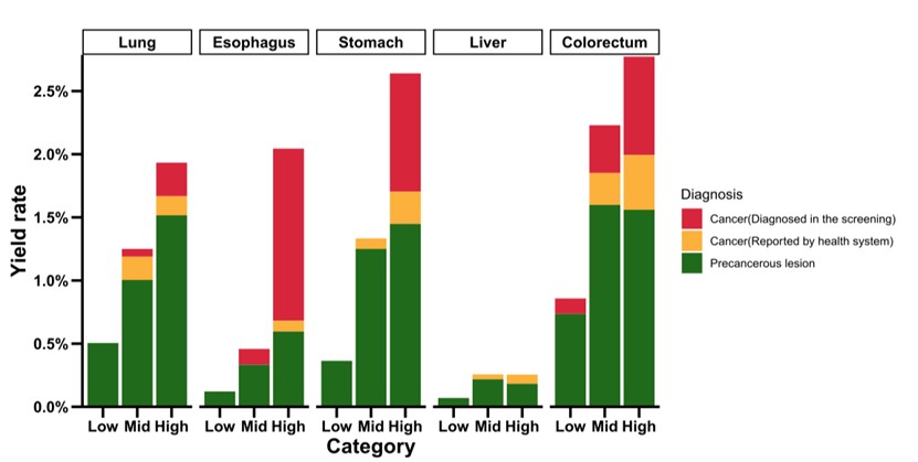 截至本次随访,有9643人参与了前瞻性随访筛查。共发现93例新发癌症病例和241例癌前病变,高风险组的癌症检出率为 9.64%,比低风险组高出5.02倍(1.92%)。食管癌的风险分层表现最为显著,高风险组检出率为低风险组的16.84倍。高风险组的总体癌症富集能力也与普通人群相比有所不同,从肝癌的1.12倍到食管癌的2.49倍不等。