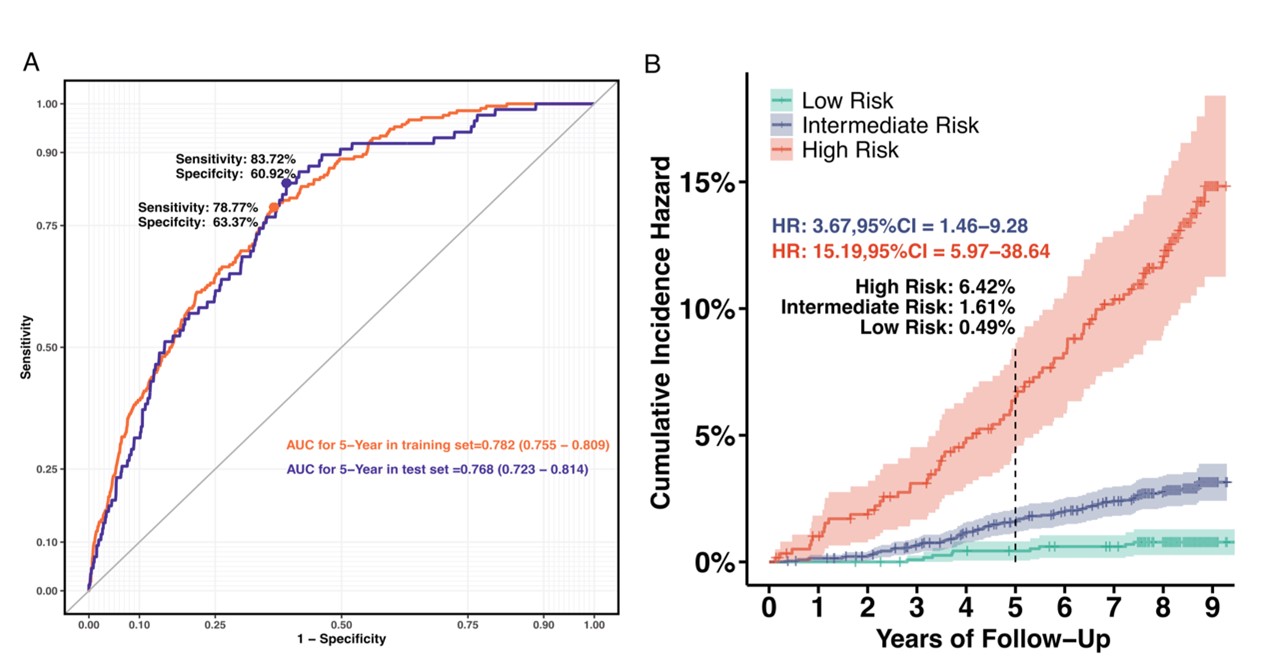PRIME模型在测试集中AUROC为0.768(95%CI:0.723 - 0.814;敏感度:83.72%,特异度:60.92%)。风险分层中,高风险组的粗发病率约为低风险组的16倍。累积发病率曲线显示,相比于低风险组,中风险组个体的风险增加 3.67 倍(95%CI:1.46-9.28),而高风险组个体的风险增加15.19倍(95%CI:5.97-38.64)。
