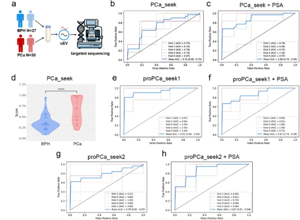 研究团队通过对组织EV DNA进行RRBS测序,结合TCGA数据库与文献报道,筛选出667个前列腺癌特异性甲基化靶点,并构建了靶向甲基化测序Panel(图5)。研究团队基于该panel成功构建出区分BPH与PCa的PCa_seek模型(AUC=0.72),结合PSA后AUC提升至0.88(图6)。