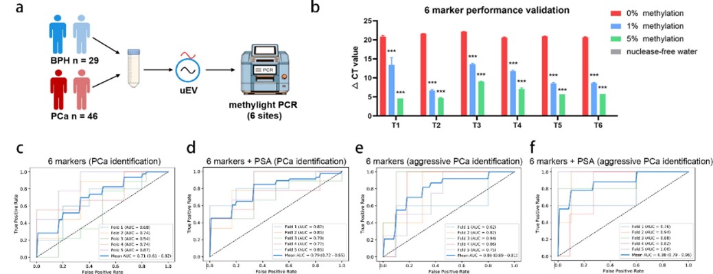 研究团队系统分析了不同EV DNA的特性,并优化了EV DNA甲基化检测流程,通过全基因组简化甲基化测序(RRBS)筛选前列腺癌特异性甲基化区域,同时整合了TCGA公共数据库及文献标志物,构建了前列腺癌特异性靶向测序组合。进一步利用机器学习,基于尿液EV DNA甲基化数据建立了鉴别良恶性及侵袭性癌的诊断模型,并锁定6个核心标志物进行PCR验证(图2)。