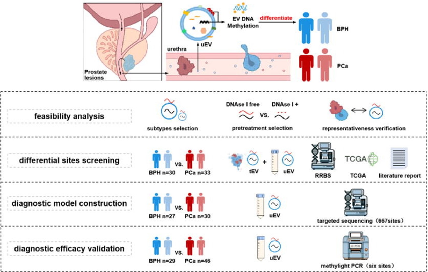 研究共纳入195例样本(86例BPH,109例PCa),设立筛选、测序验证与PCR验证三个独立队列,确保结果稳健可靠。该体系为前列腺癌无创诊断与风险分层提供了新的技术路径。