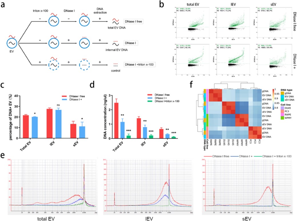 研究团队通过多种实验技术,系统分析了尿液来源的大囊泡(lEV)、小囊泡(sEV)及总囊泡(total EV)中DNA的分布、片段大小与甲基化一致性(图3)。发现两类外泌体囊泡(lEV/sEV)均能精准反映来源细胞的基因组 DNA 甲基化状态,且总外泌体囊泡(无需 DNase I 处理)可最大化保留 DNA 信息量(图4),显著简化临床检测流程。这一发现为后续技术开发奠定了关键基础,也更适合进行临床转化。