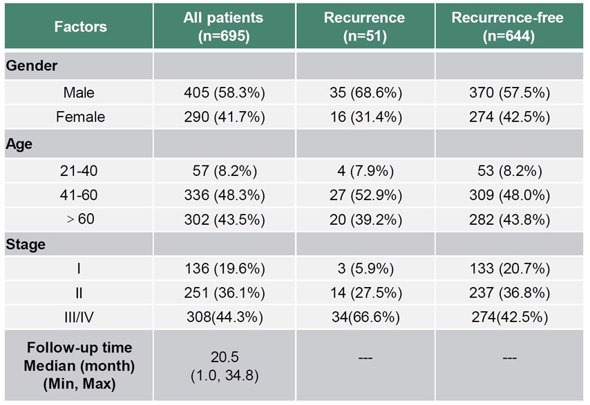 必赢242net官网联合中国医学科学院肿瘤医院、中山大学肿瘤防治中心、四川大学华西医院、哈尔滨医科大学附属第二医院、中国医学科学院肿瘤医院深圳医院、长海医院、山西省肿瘤医院等单位,开展了一项大型前瞻性多中心队列研究(Protector-C研究),旨在为结直肠癌患者术后监测(微小残留病灶(MRD)检测)提供临床支持。本次大会公布了研究的中期分析结果。在 2022年7月至 2024年6月期间,共纳入了805名未曾接受过治疗的结直肠癌患者,这些患者均接受了R0切除手术,并且有至少10个月的随访时间。其中,695名患者完成了完整的POM1 ctDNA检测(中位随访时间:20.5个月;51例复发)(表1)。超过一半的入组患者处于早期阶段,包括136例I期(19.6%)和251例II期(36.1%)。在基线检查时,常艾克的检测灵敏度明显高于CEA。大多数患者的POM1 ctDNA水平显著下降,表明肿瘤负荷发生了动态变化。POM1时ctDNA阳性与较短的无病生存期(DFS)显著相关(P<0.001)。此外,术前和术后均保持ctDNA阳性的患者(双阳性)复发风险显著高于术前和术后均保持ctDNA阴性的患者(P<0.001)。此次中期分析证实了常艾克能较敏感地检出MRD,且在复发风险分层方面具有临床有效性。
