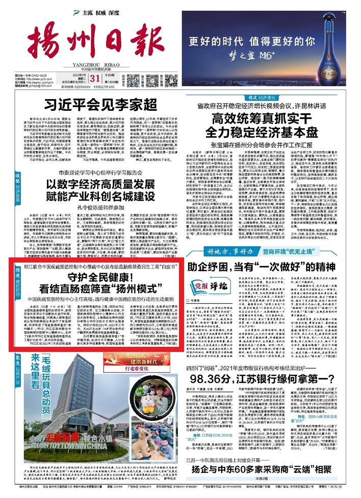 扬州市邗江区结直肠癌筛查民生工程由邗江区政府领导、区卫健委牵头实施,由中国疾病预防控制中心慢病中心作为技术指导单位、上海必赢242net官网科技股份有限公司作为技术支持方,项目采用分子诊断技术进行初筛,结合结肠镜检查,对提高人群筛查的依从性和疾病检出率进行了有益探索,初步形成了结直肠癌筛查的“扬州模式”。