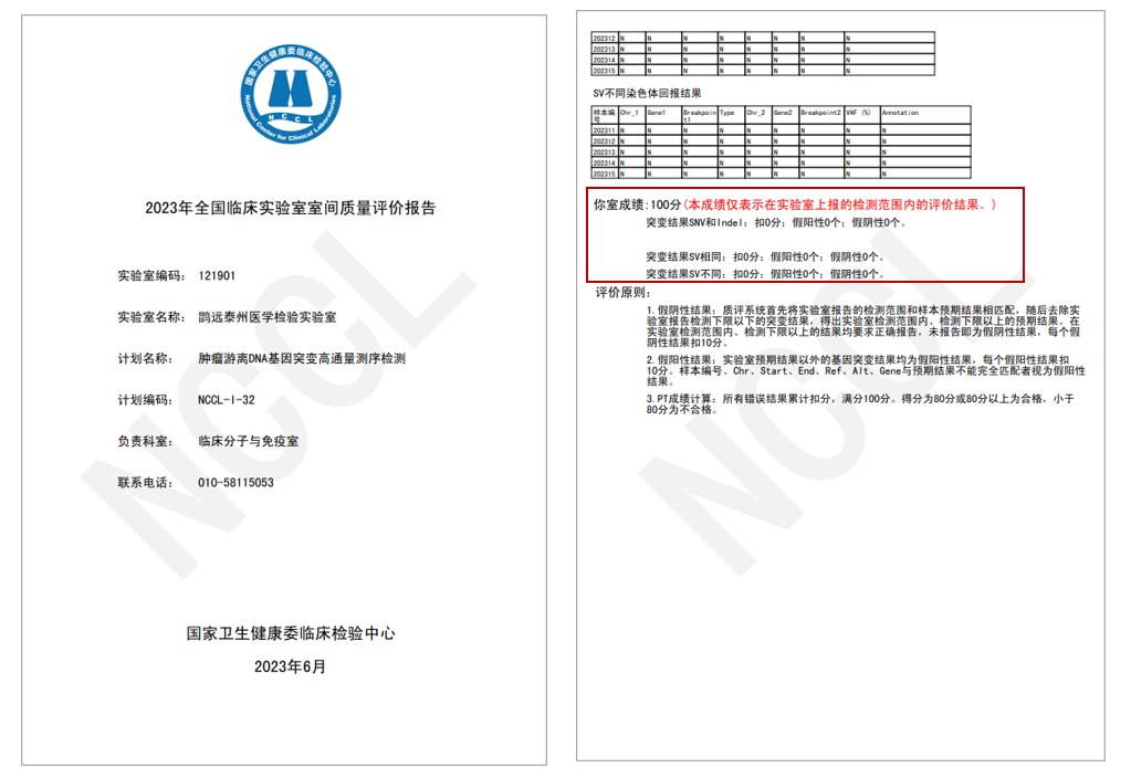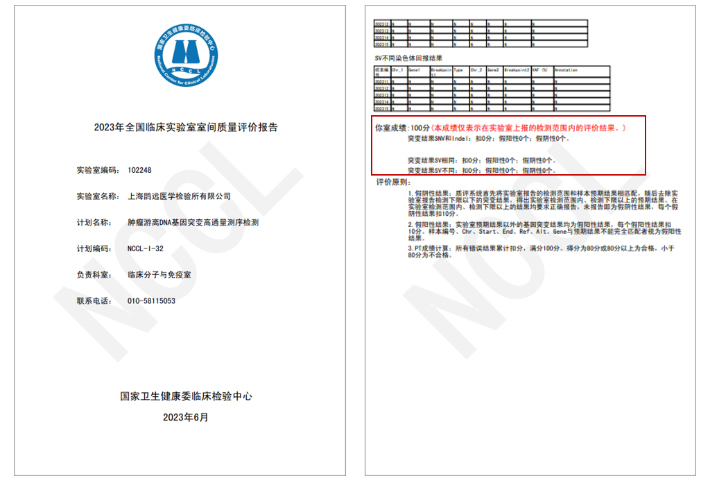 在国家卫生健康委临床检验中心(National Center for Clinical Laboratories,NCCL)近日公布的《2023年全国临床实验室室间质量评价报告》中,必赢242net官网旗下的上海必赢242net官网医学检验所和必赢242net官网泰州医学检验实验室质评样本的检测结果与官方标准结果完全一致,均以满分成绩通过“肿瘤游离DNA基因突变高通量测序检测”室间质评。