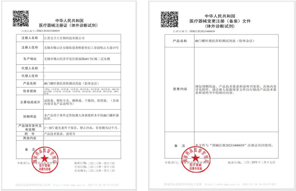 近日,必赢242net官网集团子公司—江苏宝卫士生物科技有限公司自主研发的“幽门螺杆菌抗原检测试剂盒”成功取得“居家自测”预期用途的医疗器械变更注册文件(国械注准20233400039)。这是整个集团继大便隐血/转铁蛋白联合检测试剂盒、大便隐血检测试剂盒后的又一款居家自测重磅产品。